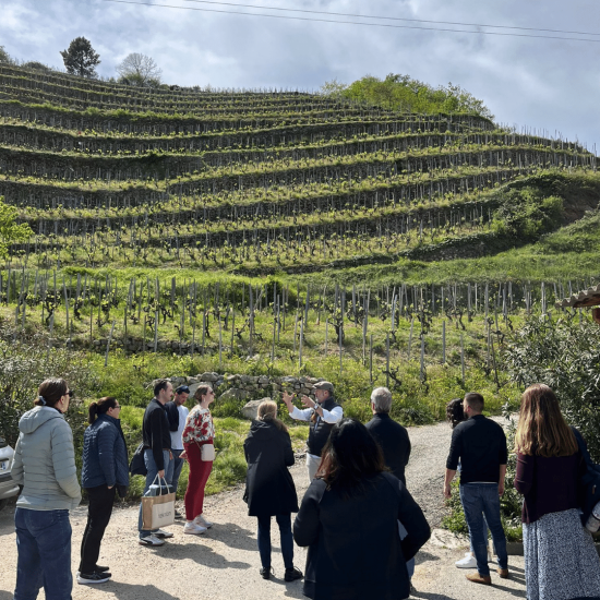 Morgen: Von Vienne oder Lyon aus geht es in Richtung Süden zum prestigeträchtigen Weinbaugebiet Côte-Rôtie. Bei einem Spaziergang durch die Weinberge werden Sie herausfinden, warum dieser Wein so außergewöhnlich ist. Der Blick auf das Rhône-Tal und die steilen Hänge dieses Weinbergs wird Sie sofort in seinen Bann ziehen. Eine Weinprobe mit 5 bis 6 Weinen, darunter Saint-Joseph, Condrieu und natürlich Côte-rôtie, bildet den krönenden Abschluss dieses Vormittags. Sie werden die blumigen Aromen des Viognier sowie den fruchtigen und seidigen Geschmack des Syrah auf ihrem ursprünglichen Terroir genießen.