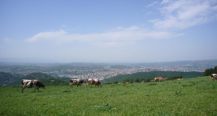 – Nach 1 km auf der Straße links auf den asphaltierten Weg abbiegen, der durch den Weiler „Le Flachat” führt. Weiter bergauf bis zur Kreuzung „La Pélarie” (402 m).