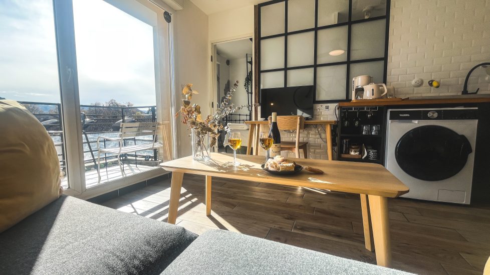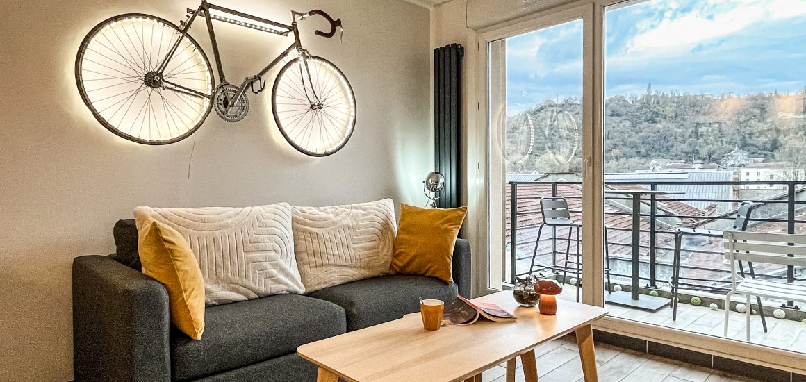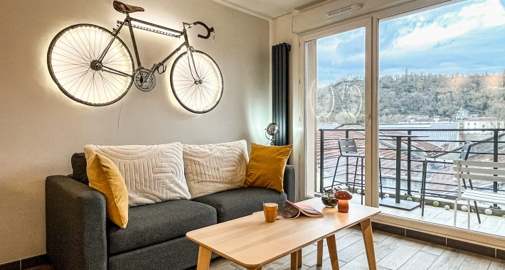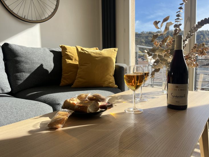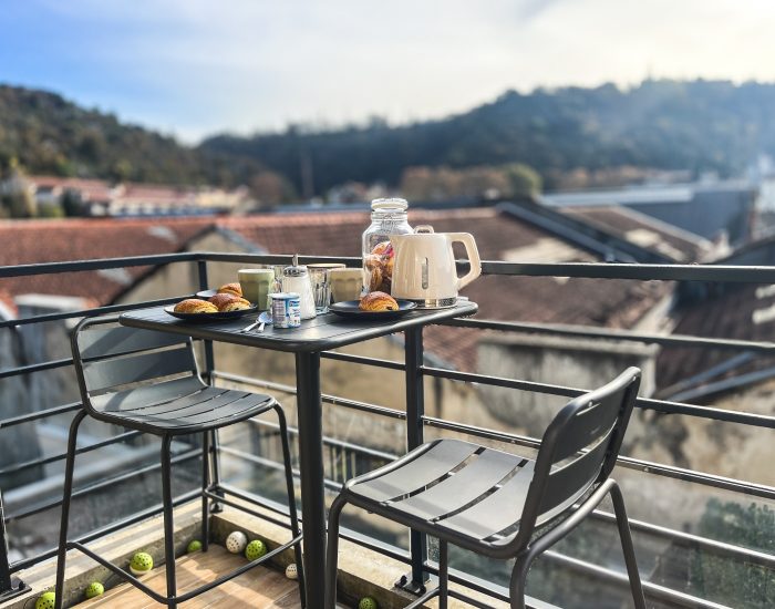 Ein großer Balkon lädt zu einer entspannten Pause in der Sonne ein. Panoramablick auf das Viertel Vienne.