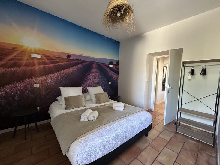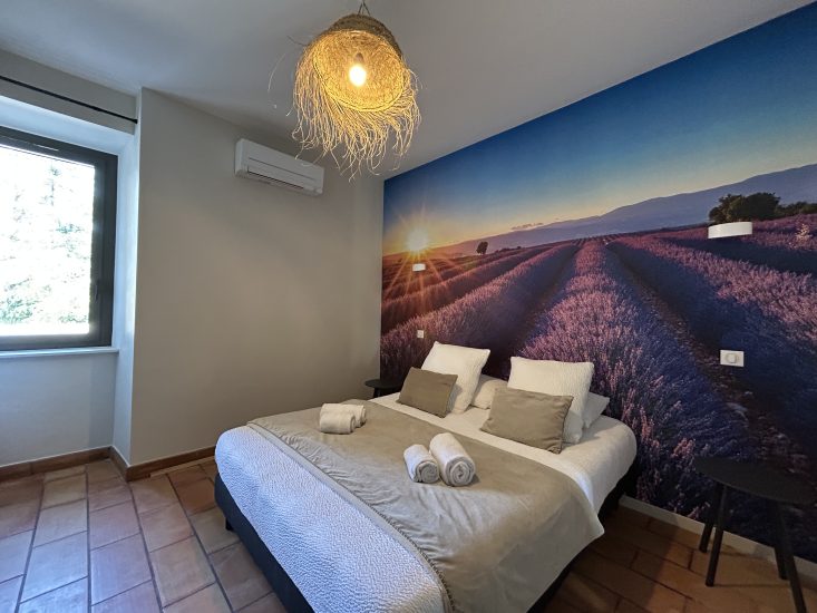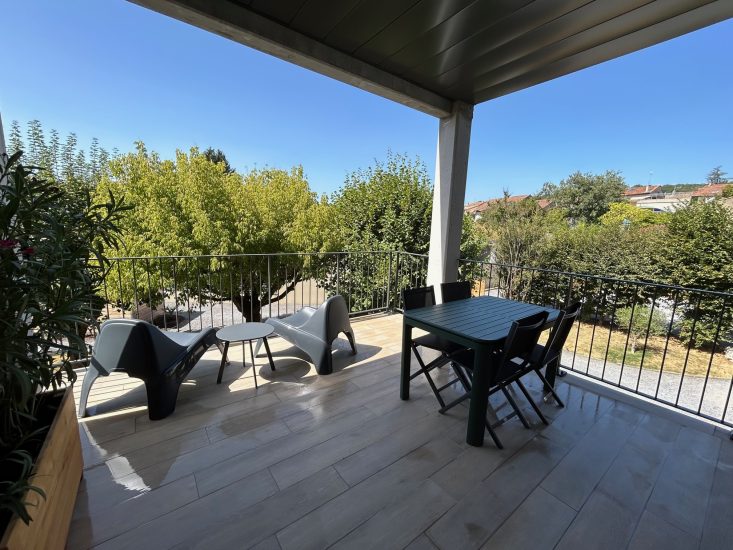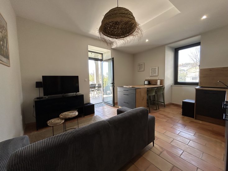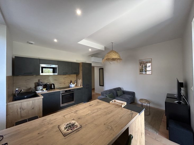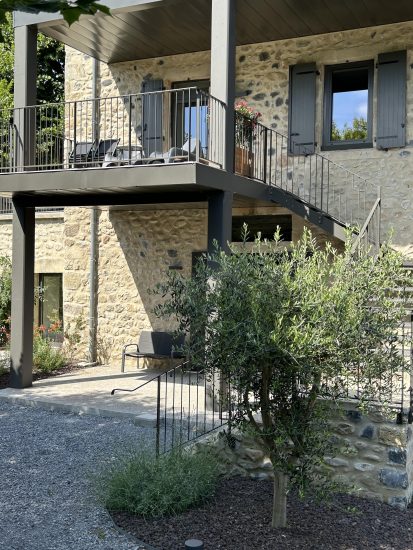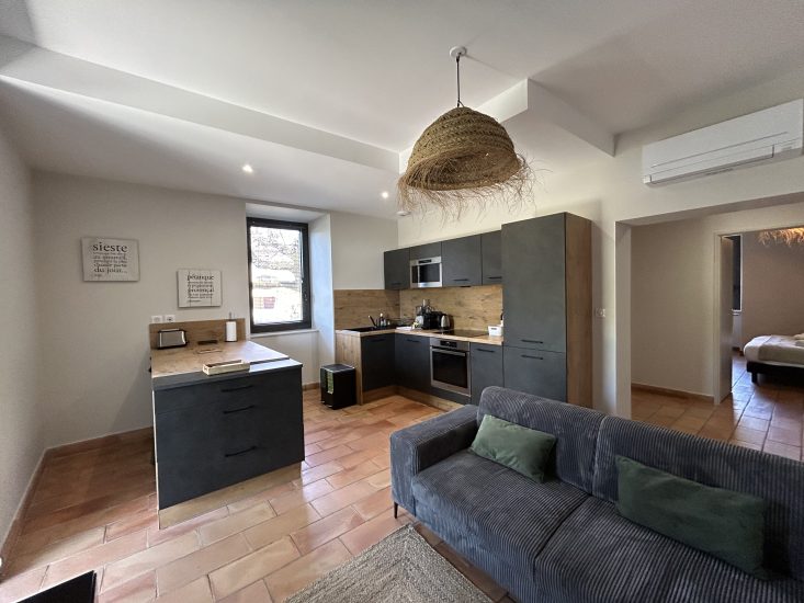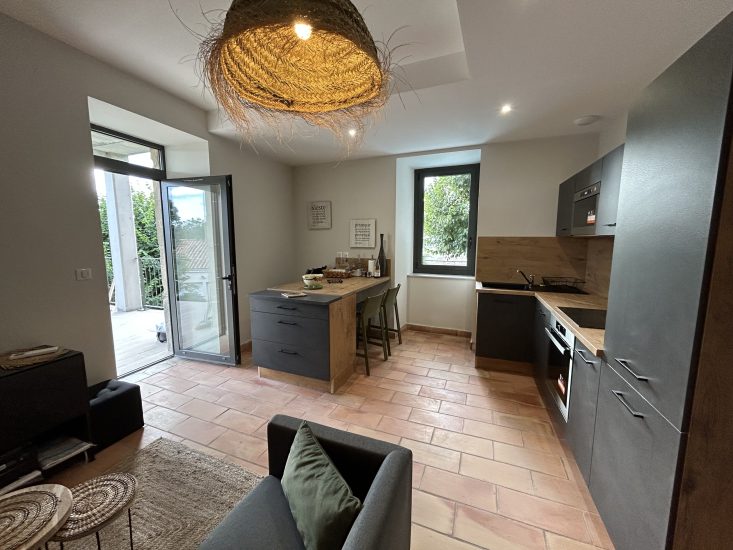 5-Sterne-Ferienwohnung 58 m² mit großer eigener Terrasse nur wenige Schritte vom Fluss Ardèche entfernt in einem vollständig renovierten Gebäude aus dem 18. Jahrhundert in der Ardèche. Jahrhundert. Vor Ort: schöner Platz mit Bäumen und einer hundertjährigen Linde, privater Pool des Clos und großer Bouleplatz.