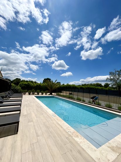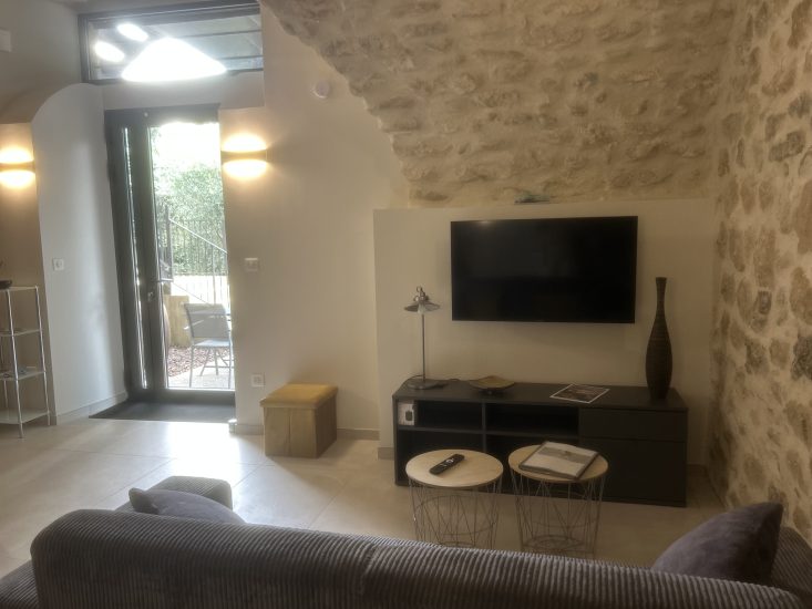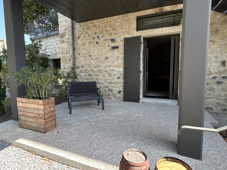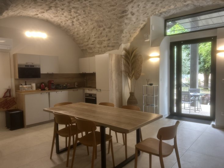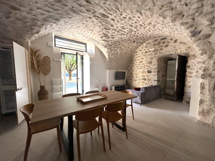 5-Sterne-Ferienwohnung 42 m² mit großer eigener Terrasse nur wenige Schritte vom Fluss Ardèche entfernt in einem vollständig renovierten Gebäude aus dem 18. Jahrhundert in der Ardèche. Jahrhundert. Vor Ort: schöner Platz mit Bäumen und einer hundertjährigen Linde, privater Pool des Clos und großer Bouleplatz.