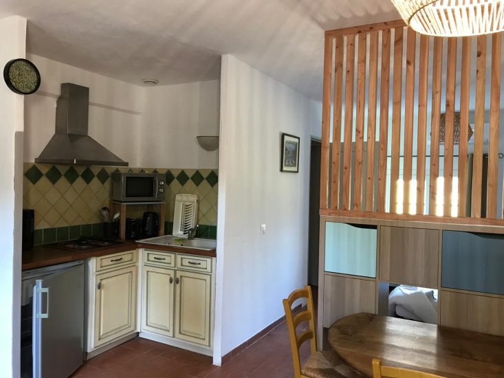 Das Gîte Basilic besteht aus einem Schlafbereich mit einem 160‑cm‑Bett sowie einer ausgestatteten Küche, die auf ein Wohnzimmer mit einem 140‑cm‑Bett geöffnet ist. Es gibt außerdem ein Badezimmer mit Waschbecken und Dusche sowie eine separate Toilette.