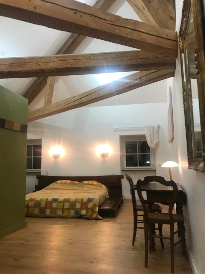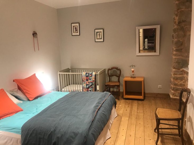 Chatus ist ein 22 m2 großes Zimmer mit Blick auf den Innenhof. Seine sichtbare Steinmauer und sein alter Parkettboden unterstreichen den Charme des Alten. Es ist mit einem Queensize-Bett, das in zwei Einzelbetten umgewandelt werden kann, und einem Einzelbett ausgestattet. Es hat ein eigenes Badezimmer.