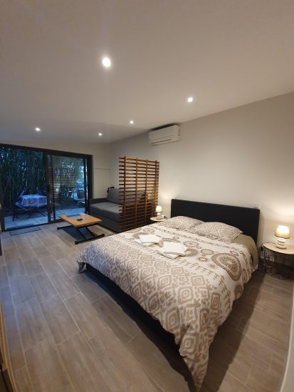 Dieses 24 m² große Ferienhaus verfügt über ein Badezimmer, eine eigene Terrasse mit Gartenmöbeln im Bambuswald und einen Zugang nach hinten mit Liegestühlen im Freien. Der Hauptraum umfasst einen Schlafbereich, einen Wohnbereich und eine Küchenzeile.