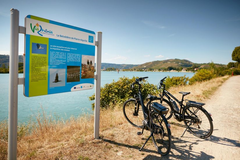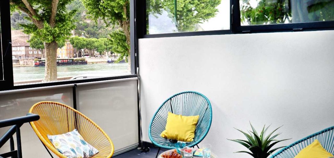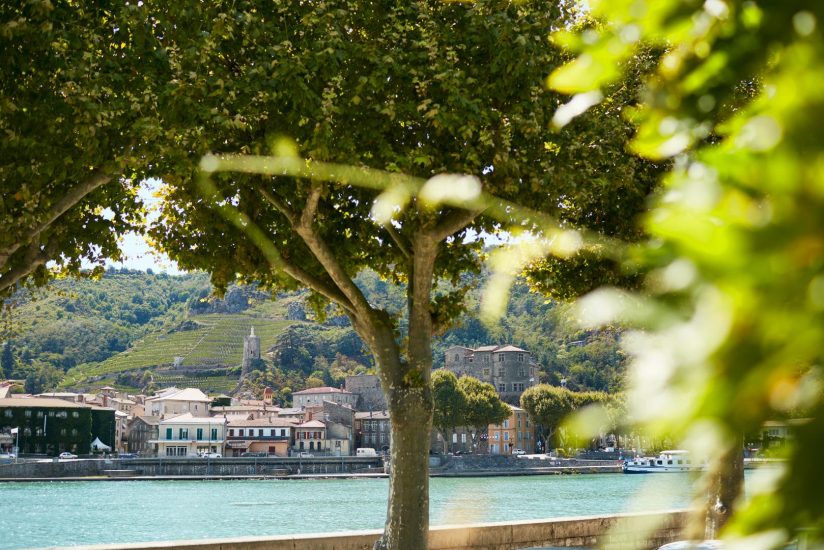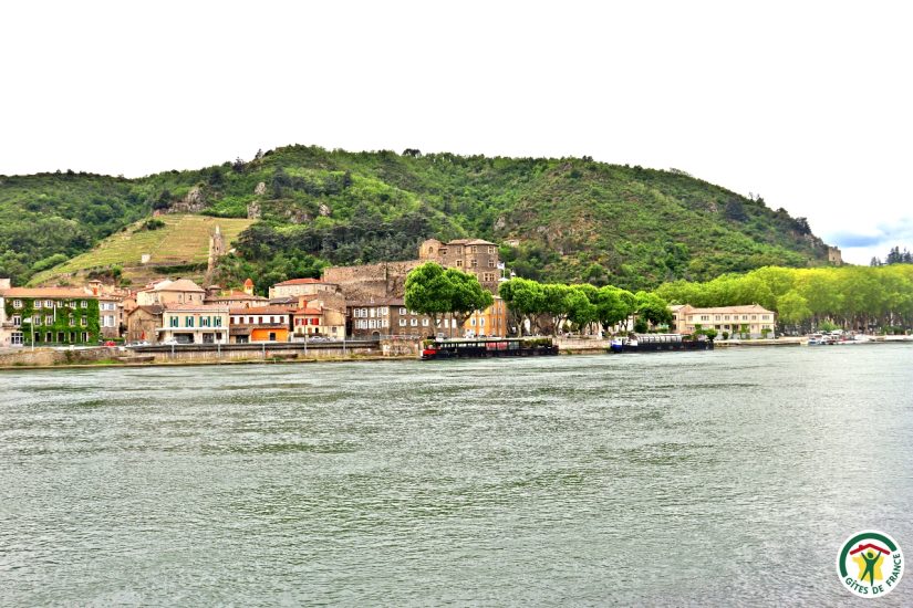 Charmantes Haus am Ufer von Tain mit atemberaubendem Blick auf die Rhône, das Château de Tournon und die Weinberge von St. Joseph; Verleih von Elektrofahrrädern.