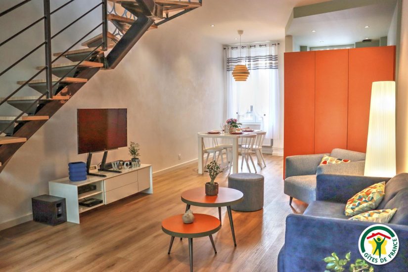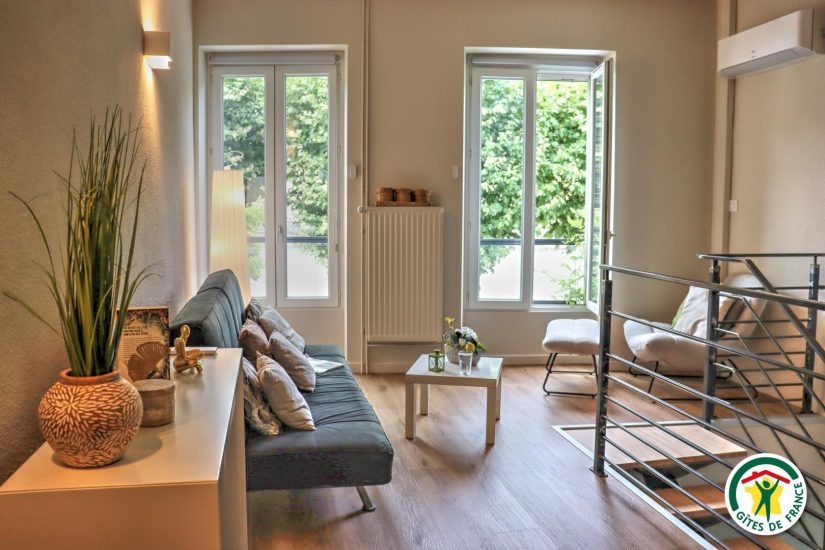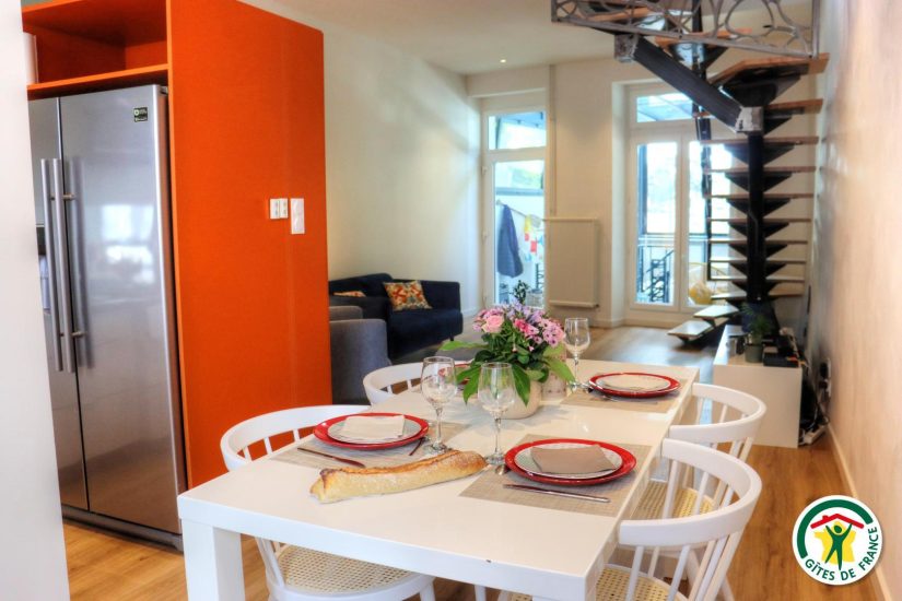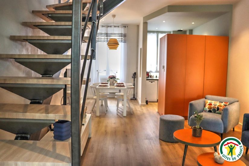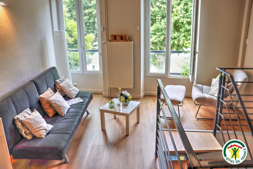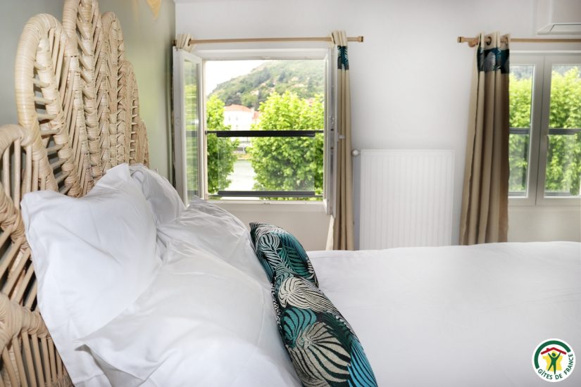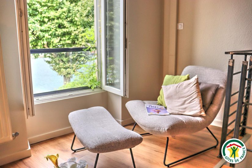 Gîte im Stadtzentrum auf 3 Ebenen mit Zugang über eine Treppe, um in die Veranda zu gelangen. Großer Wohnraum mit Küchenzeile im Erdgeschoss. Im ersten Stock, Fernsehraum und Heimkino mit einem Schlafzimmer für 2 Personen mit Bett 140x190, Badezimmer und WC, im zweiten Stock, ein Büro mit Gesellschaftsspielen und ein zweites Schlafzimmer mit Bett für 2 Personen 140x190, privates Badezimmer mit WC. Terrasse der Veranda mit Blick auf den Fluss. Privatgarage im Untergeschoss.