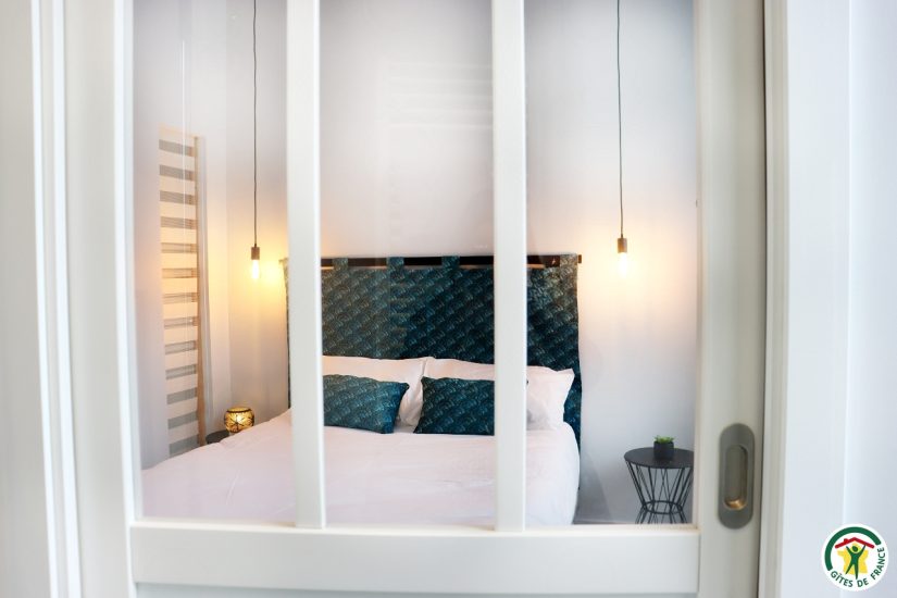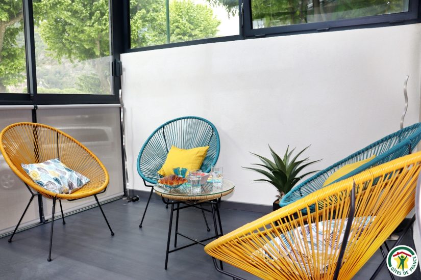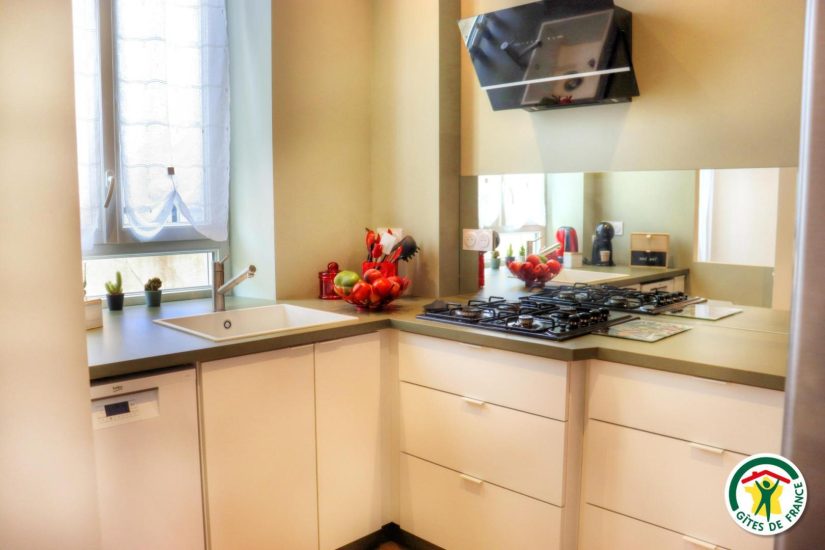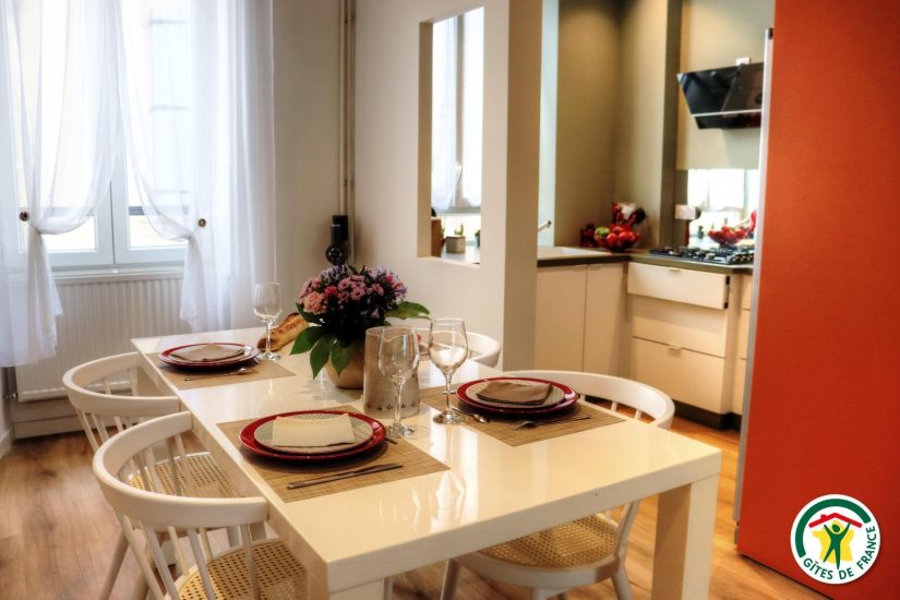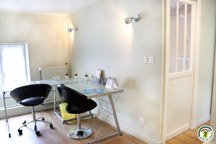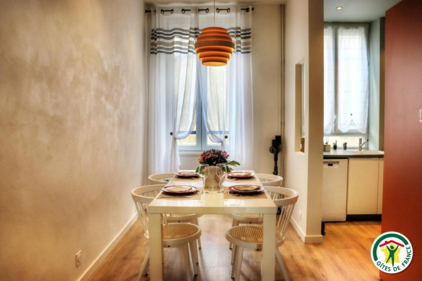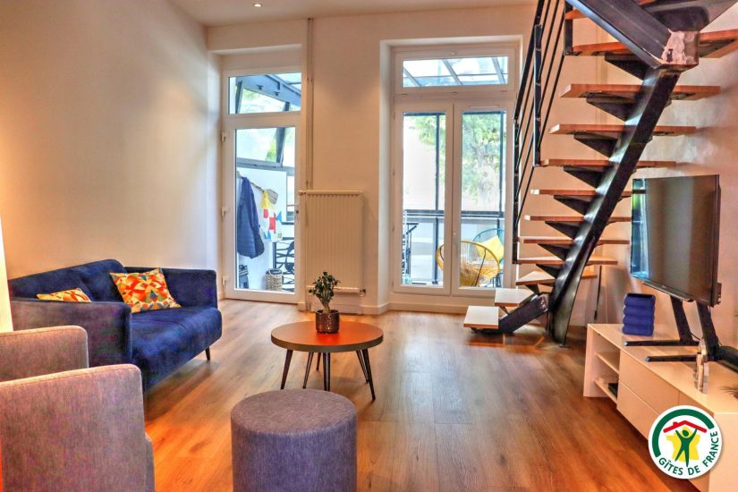 Gîte im Stadtzentrum auf 3 Ebenen mit Zugang über eine Treppe, um in die Veranda zu gelangen. Großer Wohnraum mit Küchenzeile im Erdgeschoss. Im ersten Stock, Fernsehraum und Heimkino mit einem Schlafzimmer für 2 Personen mit Bett 140x190, Badezimmer und WC, im zweiten Stock, ein Büro mit Gesellschaftsspielen und ein zweites Schlafzimmer mit Bett für 2 Personen 140x190, privates Badezimmer mit WC. Terrasse der Veranda mit Blick auf den Fluss. Privatgarage im Untergeschoss.