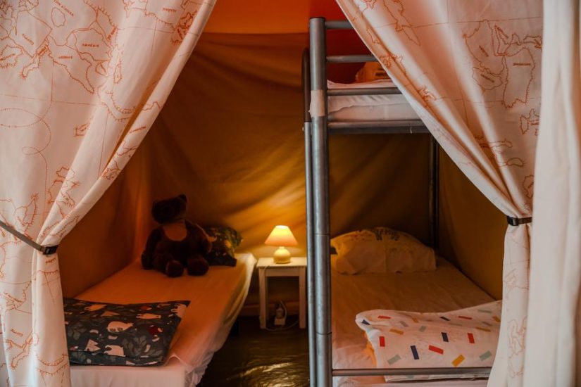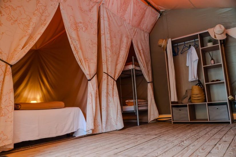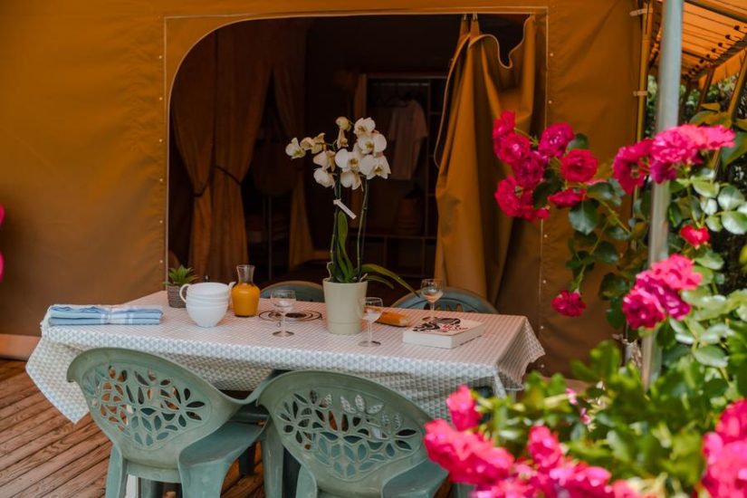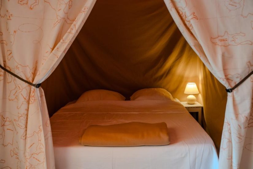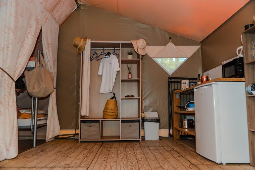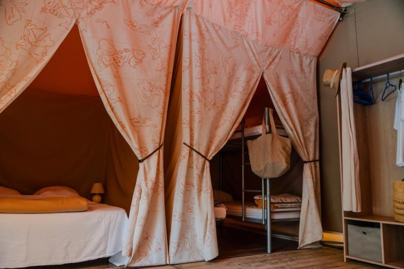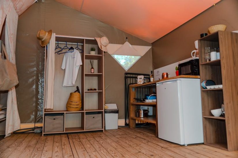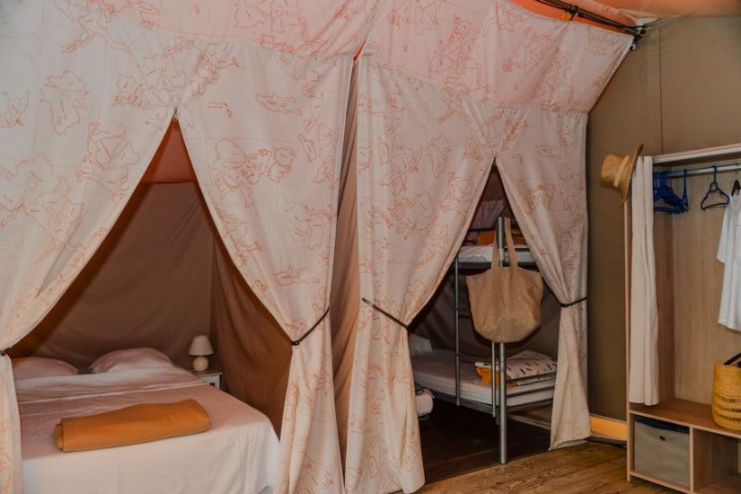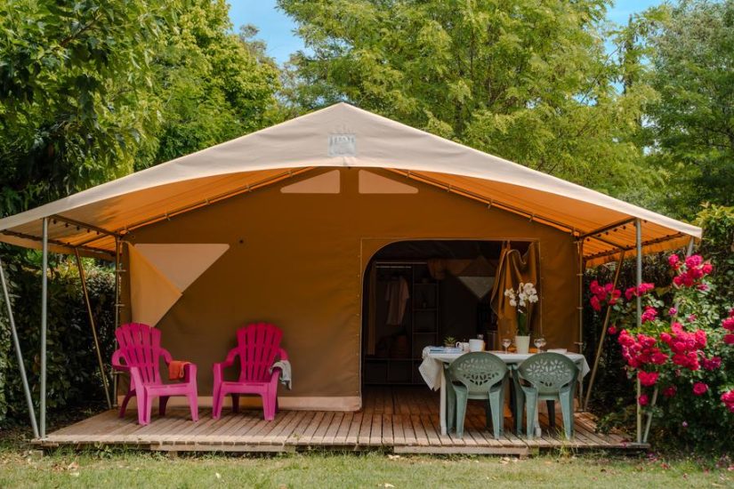 Nomadenzelt 5 Personen, ganz ausgestattet, 20 m², mit 10 m² große Terrasse. Ein echter Wunsch, zu den Wurzeln zurückzukehren und den Charme des Campingplatzes mit Komfort zu verbinden. Auf dem 4-Sterne Campingplatz mit direktem Zugang zum Fluss.